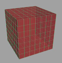 A real-world jello cube is a continuous object, and if we were to simulate every small infinitesimal part of the elastic material, infinite memory would be required. For this reason, we will discretize the jello cube. This approach (discretization) is very common in phyisically-based modeling, and also applied mathematics and engineering in general. The cube will be modeled by 8 * 8 * 8 = 512 discrete mass points, all of equal mass. In the undeformed configuration, the mass points will form a uniform grid covering the volume of the cube. They will be positioned at (i / 7, j / 7, k / 7), where i, j, k are in { 0, 1, 2, 3, 4, 5, 6, 7 }. The rest length of all the springs will be determined based on the positions of the mass points in the undeformed configuration. As the cube deforms, the points will change position, giving us the shape of the cube at any given moment of time. Note that as the cube deforms, the points will no longer be the same distance apart from their neighbors. At places where the jello cube is squeezed, the points will be closer together, and where it is stretched, they will be farther apart than in the undeformed position.